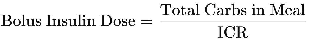 Example: 50g of carbs ÷ 10 (ICR) = 5 units of insulin.