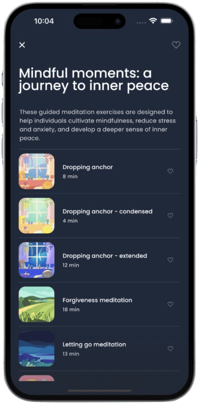 - Guided meditation sessions: Tailored for various needs such as stress reduction, improved sleep, focus enhancement, and emotional balance.