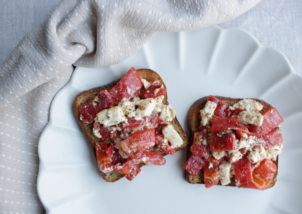 - Mix red peppers, feta, olive oil, oregano, and salt and pepper